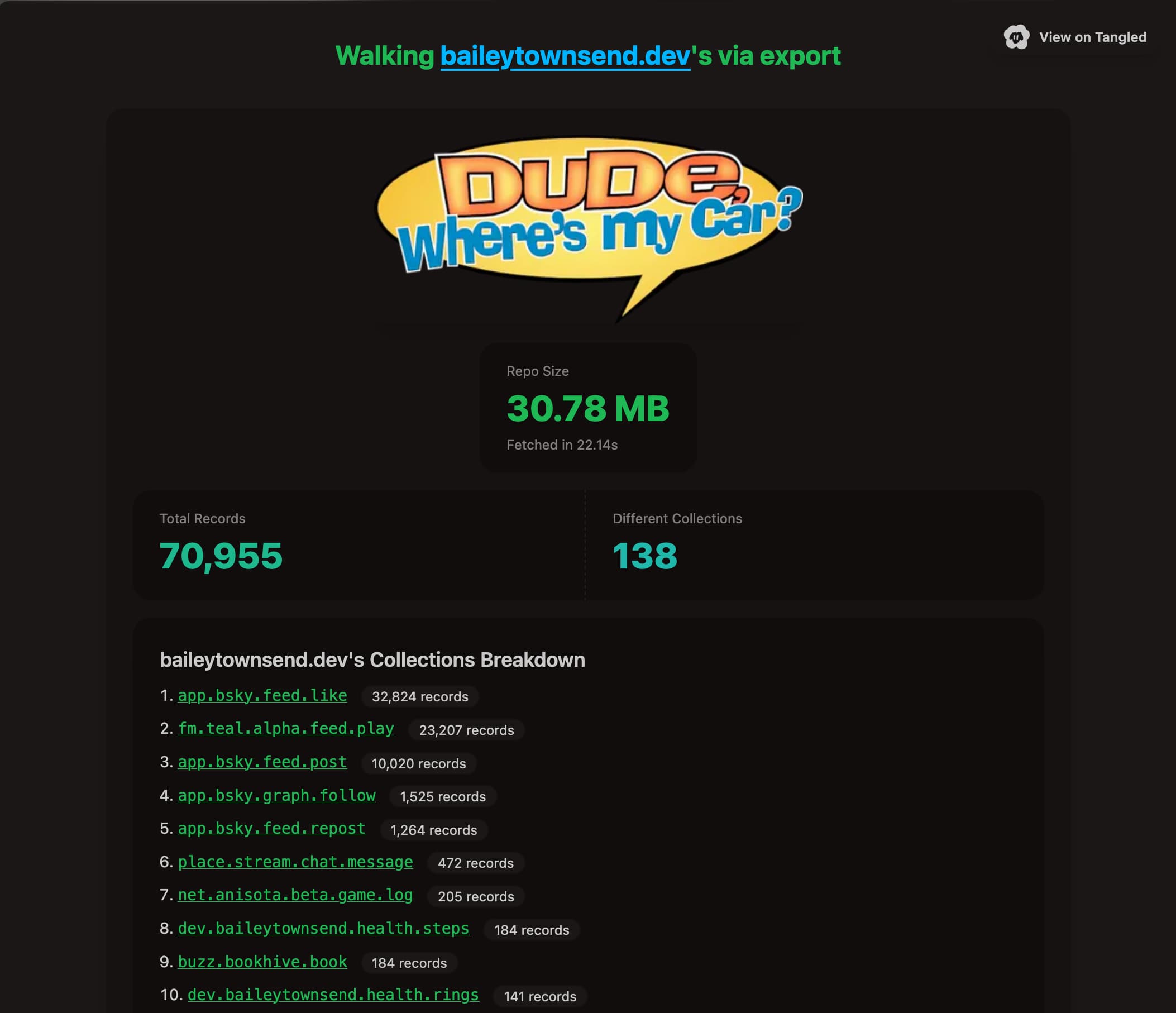 A demo showing how to use @atcute to download a user's repo and "walk" it to access all the records inside of it faster than you would via multiple api calls. If you're just wanting to see that code directly it's here.