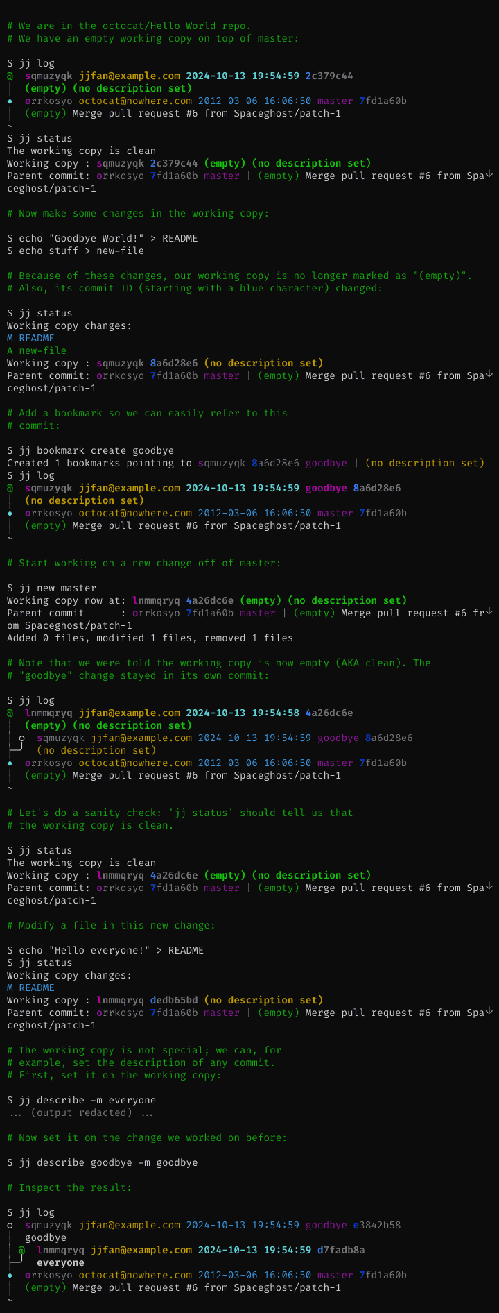 With Jujutsu, the working copy plays a smaller role than with Git. Commands snapshot the working copy before they start, then they update the repo, and then the working copy is updated (if the working-copy commit was modified). Almost all commands (even checkout!) operate on the commits in the repo, leaving the common functionality of snapshotting and updating of the working copy to centralized code. For example, jj restore (similar to git restore) can restore from any commit and into any commit, and jj describe can set the commit message of any commit (defaults to the working-copy commit).