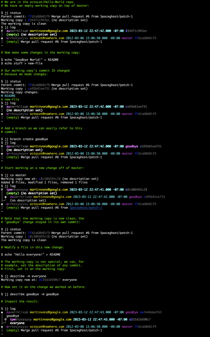 Most Jujutsu commands automatically commit the working copy. This leads to a simpler and more powerful interface, since all commands work the same way on the working copy or any other commit. It also means that you can always check out a different commit without first explicitly committing the working copy changes (you can even check out a different commit while resolving merge conflicts).