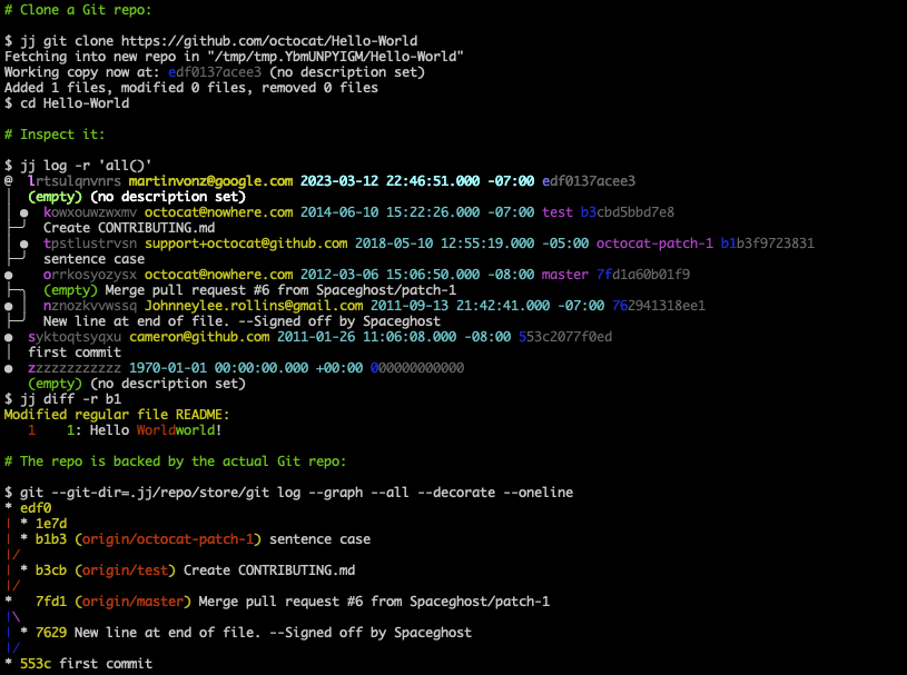 Jujutsu has two backends. One of them is a Git backend (the other is a native one 1). This lets you use Jujutsu as an alternative interface to Git. The commits you create will look like regular Git commits. You can always switch back to Git. The Git support uses the libgit2 C library.