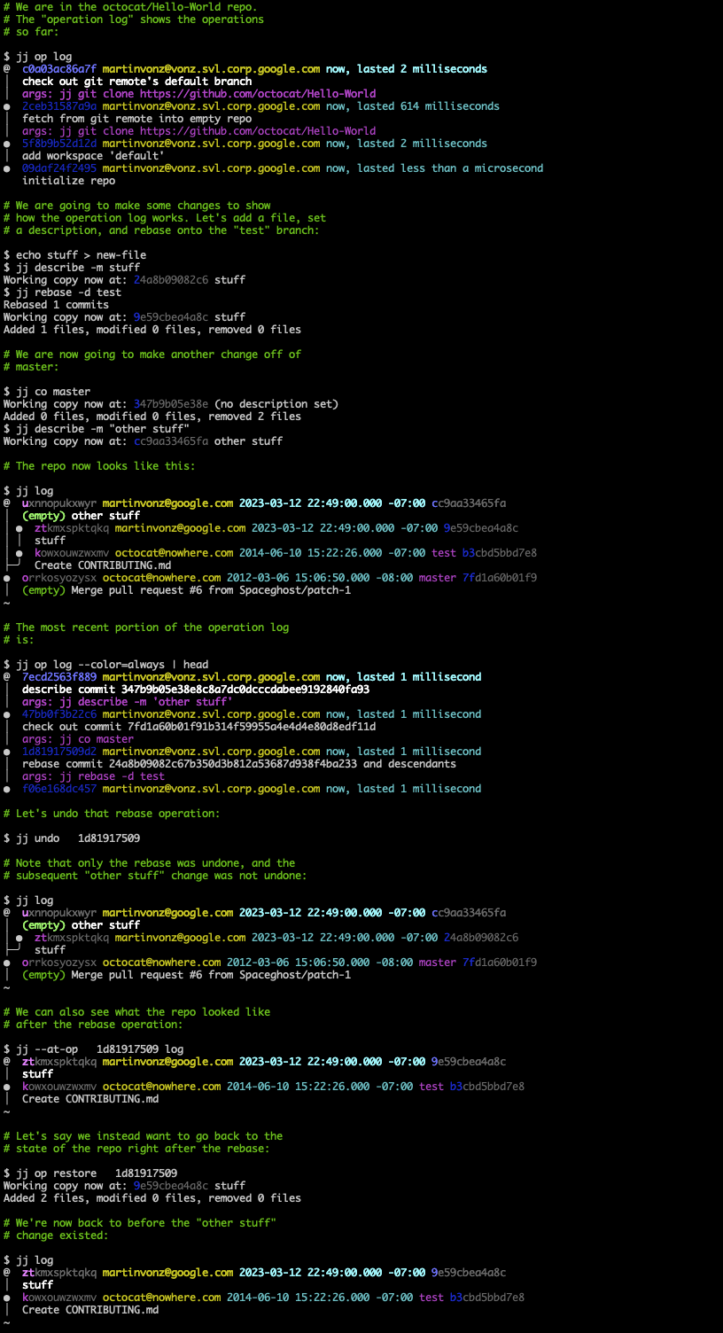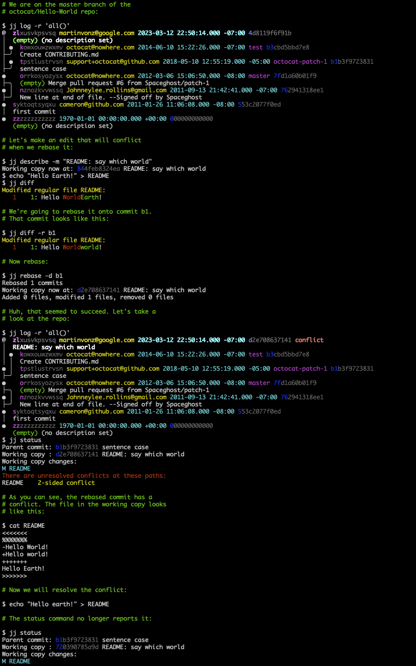 If an operation results in conflicts, information about those conflicts will be recorded in the commit(s). The operation will succeed. You can then resolve the conflicts later. One consequence of this design is that there's no need to continue interrupted operations. Instead, you get a single workflow for resolving conflicts, regardless of which command caused them. This design also lets Jujutsu rebase merge commits correctly (unlike both Git and Mercurial).