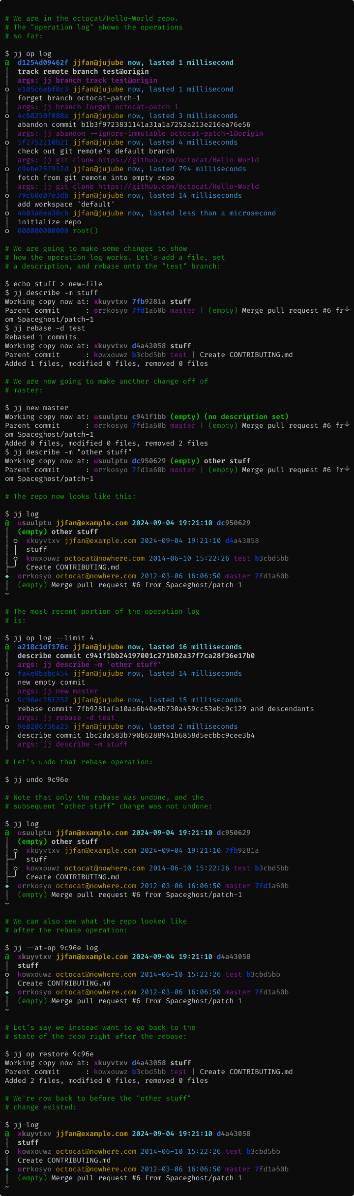 Operation log & undo: Jujutsu records every operation that is performed on the repository, from commits, to pulls, to pushes. This makes debugging problems like "what just happened?" or "how did I end up here?" easier, especially when you're helping your coworker answer those questions about their repository! And because everything is recorded, you can undo that mistake you just made with ease. Version control has finally entered the 1960s!
