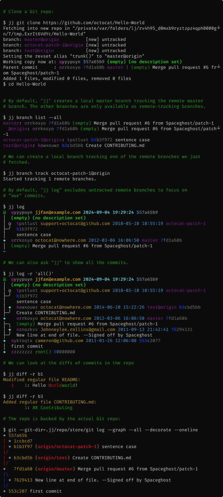 Here is how you can explore a GitHub repository with jj.