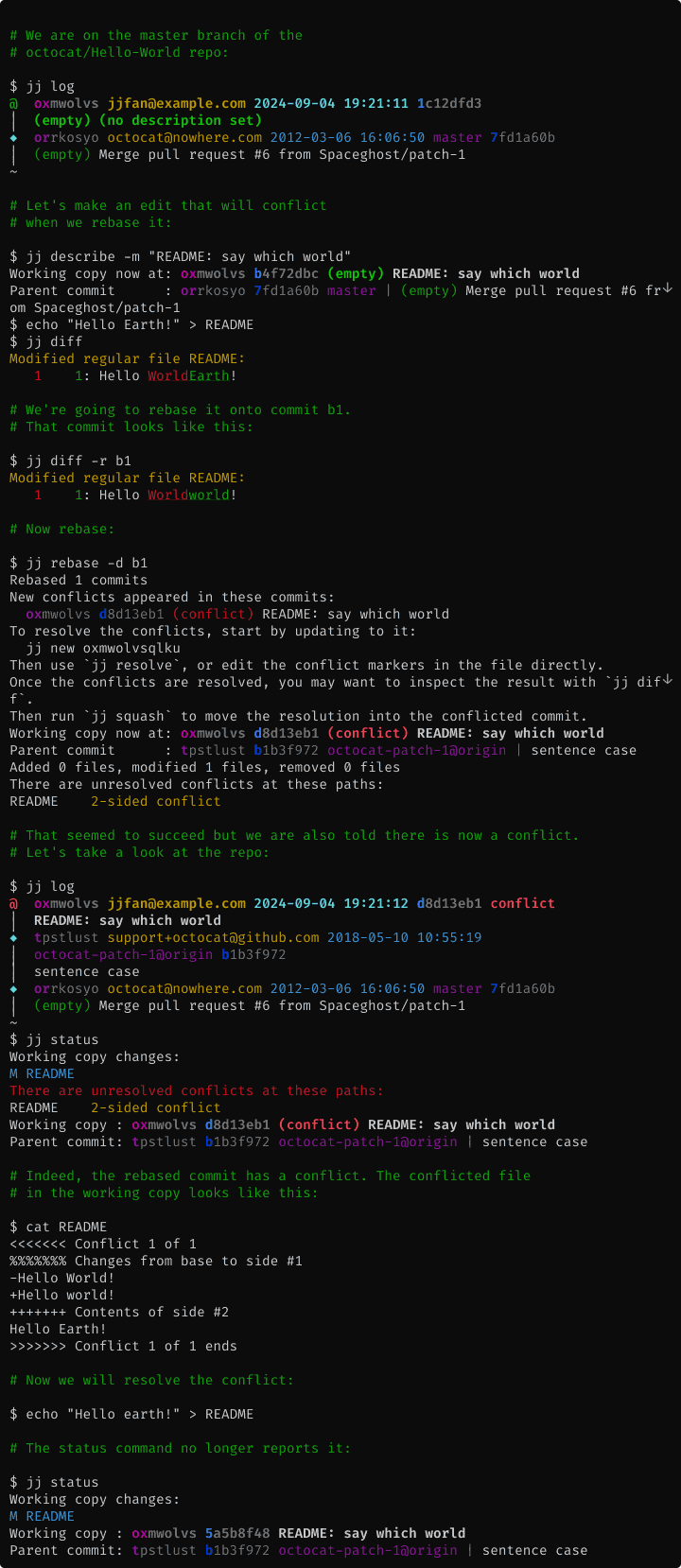 Whenever you modify a commit, any descendants of the old commit will be rebased onto the new commit. Thanks to the conflict design described above, that can be done even if there are conflicts. Bookmarks pointing to rebased commits will be updated. So will the working copy if it points to a rebased commit.