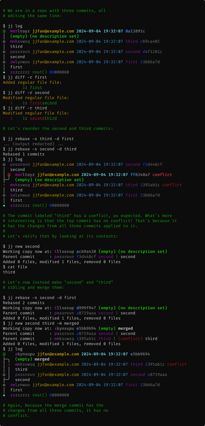 If an operation results in conflicts, information about those conflicts will be recorded in the commit(s). The operation will succeed. You can then resolve the conflicts later. One consequence of this design is that there's no need to continue interrupted operations. Instead, you get a single workflow for resolving conflicts, regardless of which command caused them. This design also lets Jujutsu rebase merge commits correctly (unlike both Git and Mercurial).