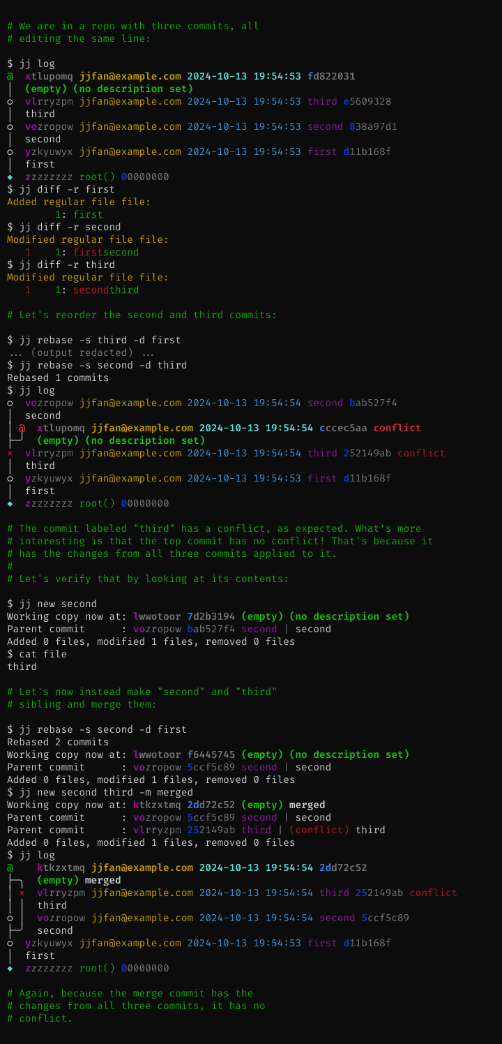 If an operation results in conflicts, information about those conflicts will be recorded in the commit(s). The operation will succeed. You can then resolve the conflicts later. One consequence of this design is that there's no need to continue interrupted operations. Instead, you get a single workflow for resolving conflicts, regardless of which command caused them. This design also lets Jujutsu rebase merge commits correctly (unlike both Git and Mercurial).