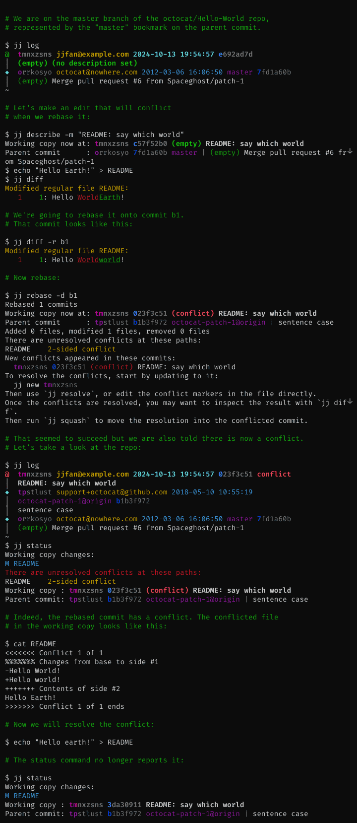 Whenever you modify a commit, any descendants of the old commit will be rebased onto the new commit. Thanks to the conflict design described above, that can be done even if there are conflicts. Bookmarks pointing to rebased commits will be updated. So will the working copy if it points to a rebased commit.