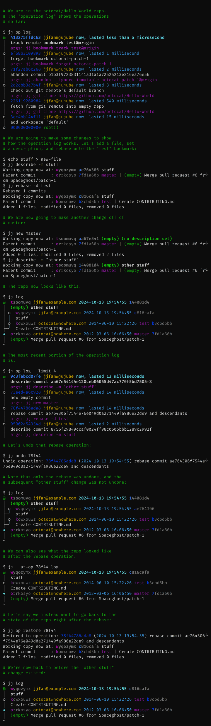 All operations you perform in the repo are recorded, along with a snapshot of the repo state after the operation. This means that you can easily revert to an earlier repo state, or to simply undo a particular operation (which does not necessarily have to be the most recent operation).