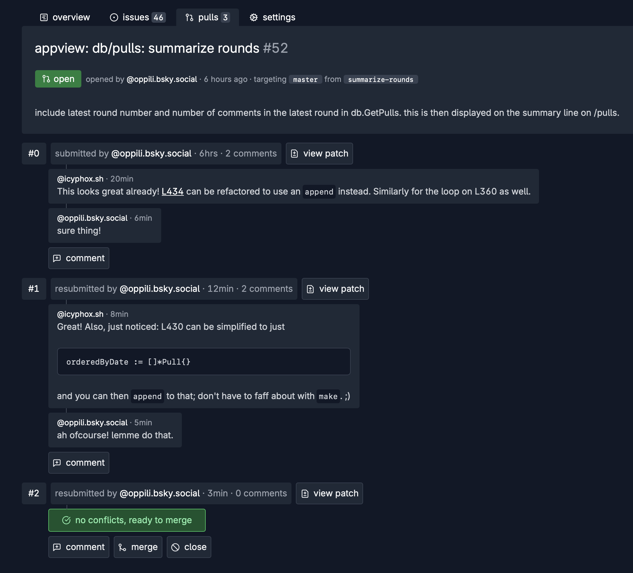 And just like earlier, we produce the patch by diffing your feature branch with the hidden tracking ref. Also, the entire pull request is stored as an atproto record and updated each time the patch changes.