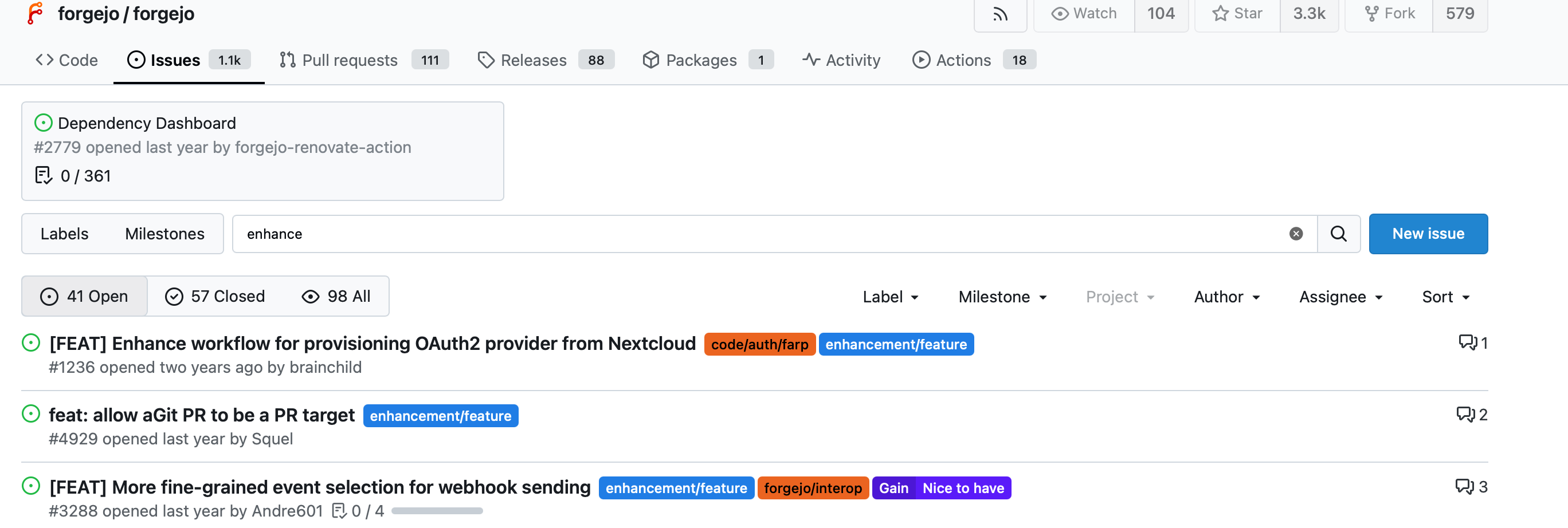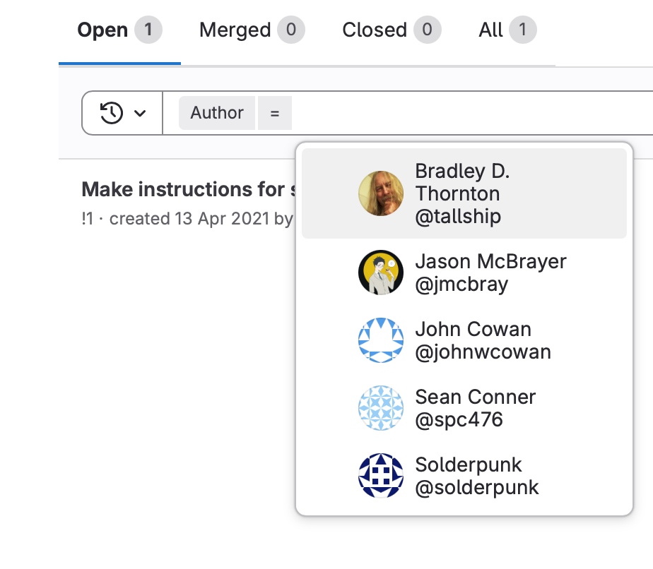 Like Tangled, issues and pulls are separate. Unlike all the other products considered here, non-keyword filters (label, author, etc.) are kept out of the search bar. I don't like this much at allβwhen you're looking at a page of results there is essentially no feedback about what combination of filters are in effect. You have to click on drop-downs and go scrolling to see what's selected. They have implemented some fancy selection logic, e.g. author allows only one selection; meanwhile labels can be grouped such that certain subsets of labels can only have one selected, and this is enforced in the search filter. Oddly, typing multiple keywords seems to be an OR rather than an AND? Overall, not a fan.