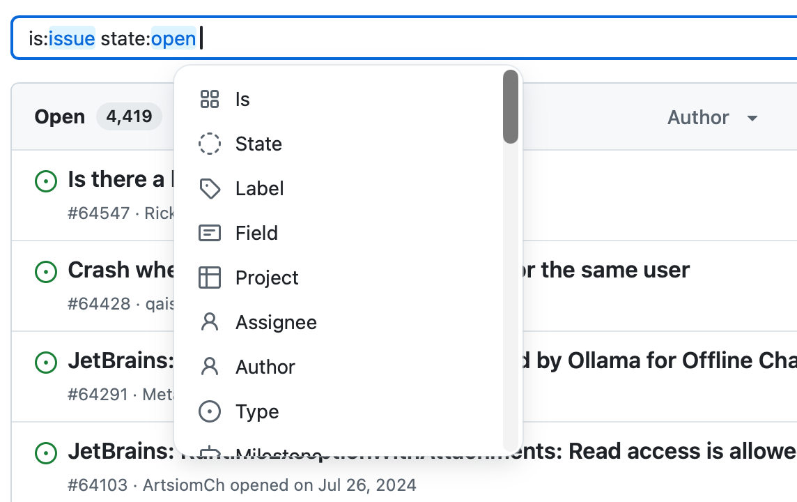- Try to autocomplete values from first keystroke: so if I click in search and type "goo" then my top suggestion in the dropdown is "label:good-first-issue"