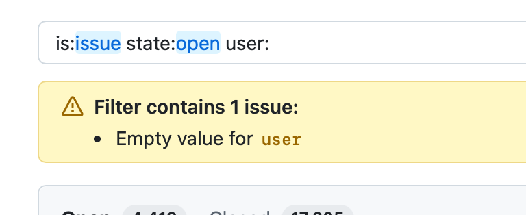 GitHub search uses a relatively normal text field where key:value items are treated differently from regular search keywords. It provides obvious and explicit UI menus for adding common filters. Many others are only accessible by typing them explicitly. There is a JS-driven autocomplete drop-down when you focus the textfield that walks you through configuring all available filters. When it detects you're typing a key:value, keys are autocompleted by typing from the left; values are autocompleted by matching anywhere within the text. -key:value is used for negation, which is recognisable from search engines and tidy. Unfortunately because any typed tag could be a negation, it is difficult to filter out the repeated use of a tag that is nonsensical, e.g., two issue authors. The autocomplete dropdown is sophisticated and intuitive and there is client-side validation if the current filter state doesn't make sense.