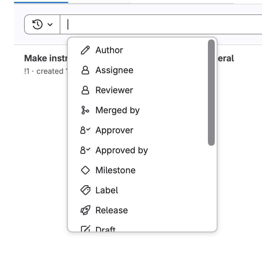 key:valuepairs become represented as coloured rectangles that are single entity. This enables more efficient editing, e.g. press backspace once to clear a particularkey:valuefilter. They have a sophisticated drop-down, but also a bunch of examples on their search page and lists of values you can filter on. Their product is extremely code-search-centric so it makes sense that they spend a lot of UI complexity on making this as discoverable and efficient as possible.Gitlab