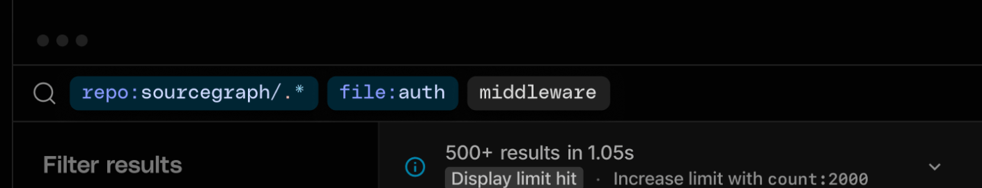 key:valueitems are treated differently from regular search keywords. It provides obvious and explicit UI menus for adding common filters. Many others are only accessible by typing them explicitly. There is a JS-driven autocomplete drop-down when you focus the textfield that walks you through configuring all available filters. When it detects you're typing akey:value, keys are autocompleted by typing from the left; values are autocompleted by matching anywhere within the text.-key:valueis used for negation, which is recognisable from search engines and tidy. Unfortunately because any typed tag could be a negation, it is difficult to filter out the repeated use of a tag that is nonsensical, e.g., two issue authors. The autocomplete dropdown is sophisticated and intuitive and there is client-side validation if the current filter state doesn't make sense.Sourcegraph